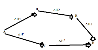 - दुसरे पथ के अनुसार A पहले D में फिर D से E में तथा अंत में B में परिवर्तित होता है , इन पथों में अवशोषित ऊष्माये △H1 , △H2 व △H3 है।