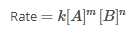 यहाँ [A] और [B] , क्रियाकारक A और B की सांद्रता को दर्शाती है और m और n को स्टाइकियोमीट्री गुणांक कहलाता है , m और n का मान प्रयोगों द्वारा ज्ञात किया जा सकता है इसलिए इनका मान a aur b के बराबर हो भी सकता है और न भी अर्थात प्रयोगों से कभी कभी m और n का मान क्रमशः a और b के बराबर भी प्राप्त हो जाता है।