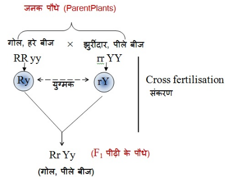 F2 पीढ़ी में फिनोटाइप = गोल ,पीले बीज : गोल,हरे बीज : झुर्रीदार ,पीले बीज : झुर्रीदार ,हरे बीज