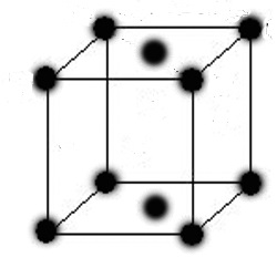 (ii) फलक केन्द्रित एकक कोष्ठिका (face centred unit cell) : इस प्रकार की एकक कोष्ठिका में कोनों पर अवयवी कणों के अतिरिक्त प्रत्येक फलक के केंद्र में अवयवी कण उपस्थित होते है।